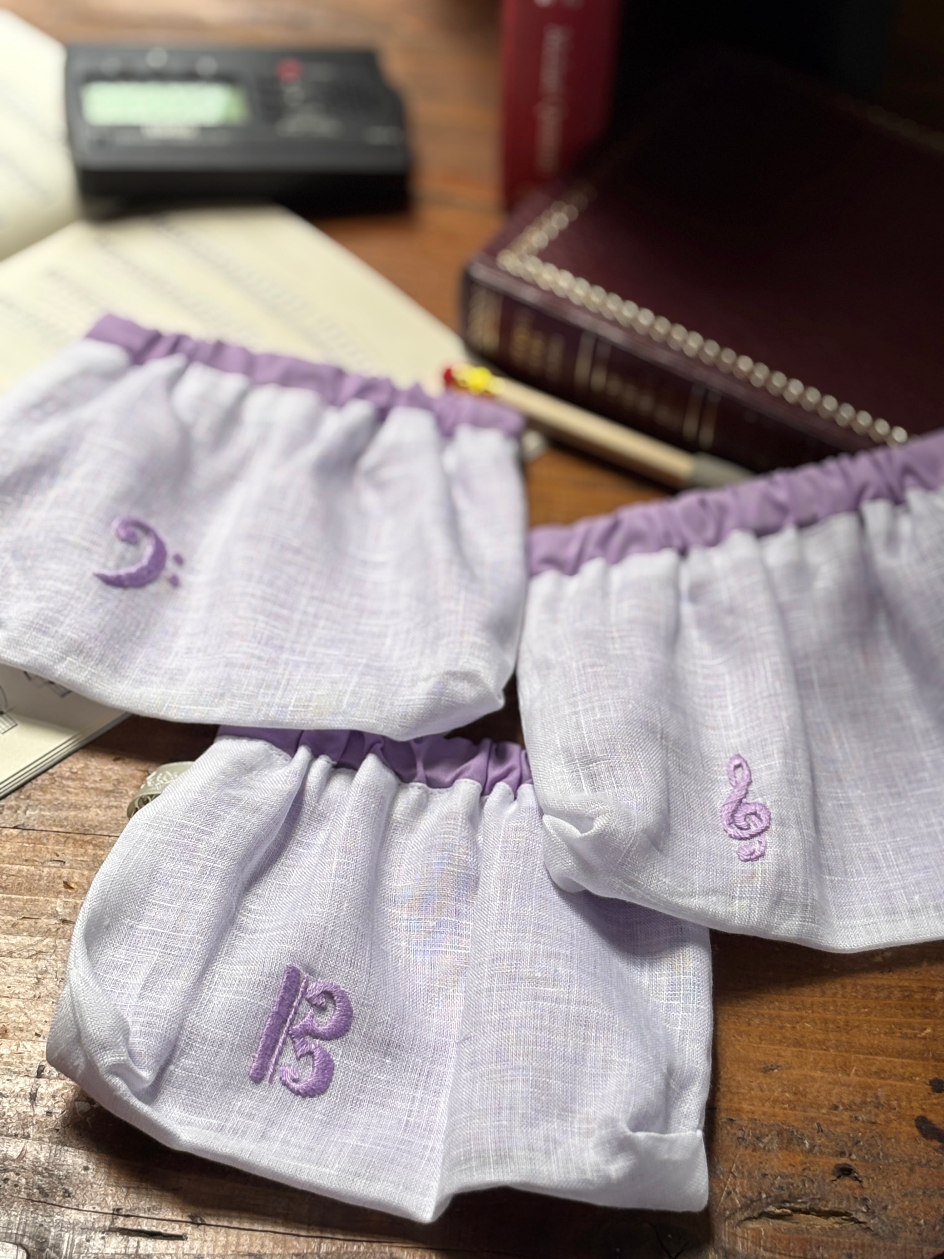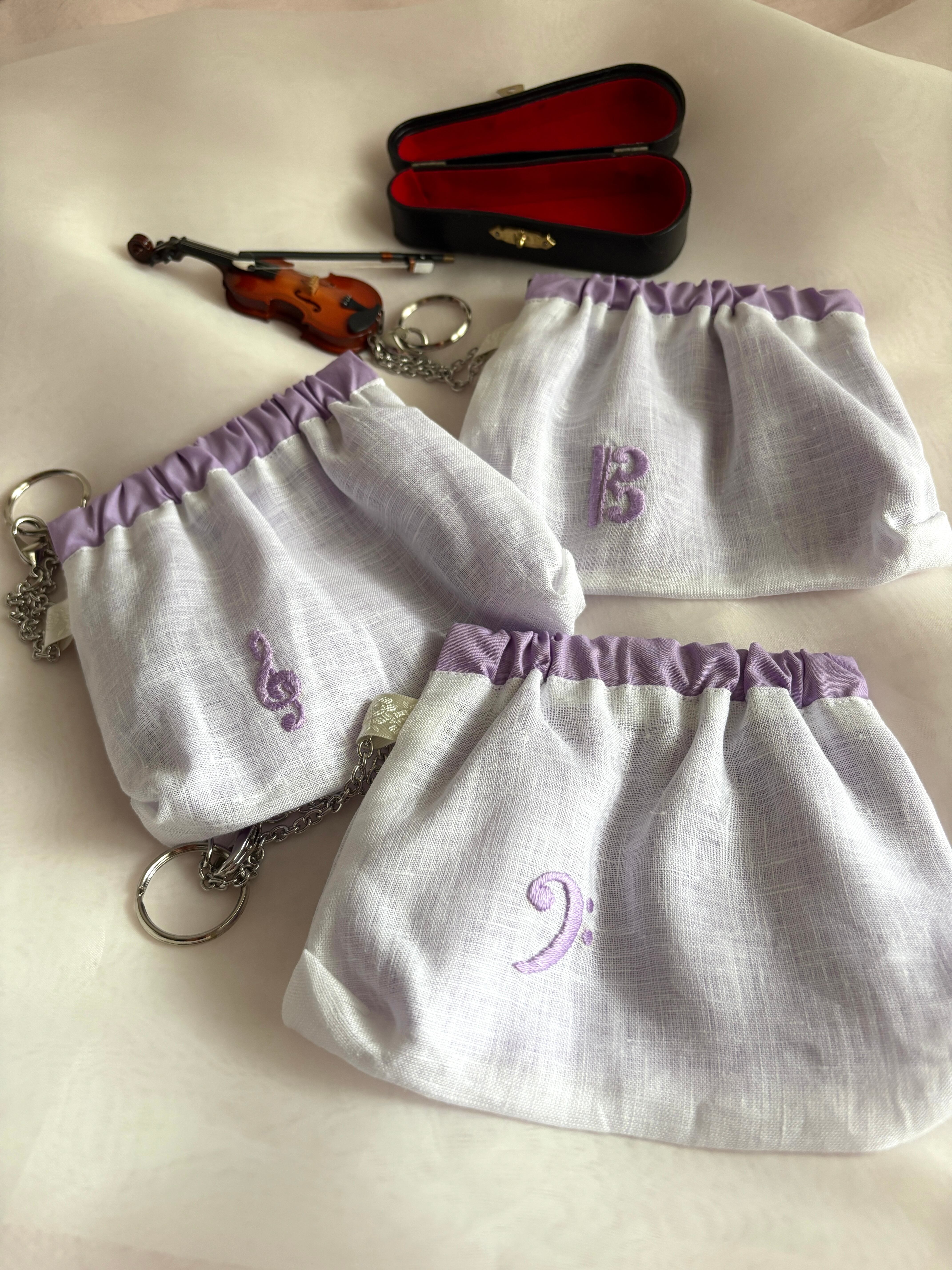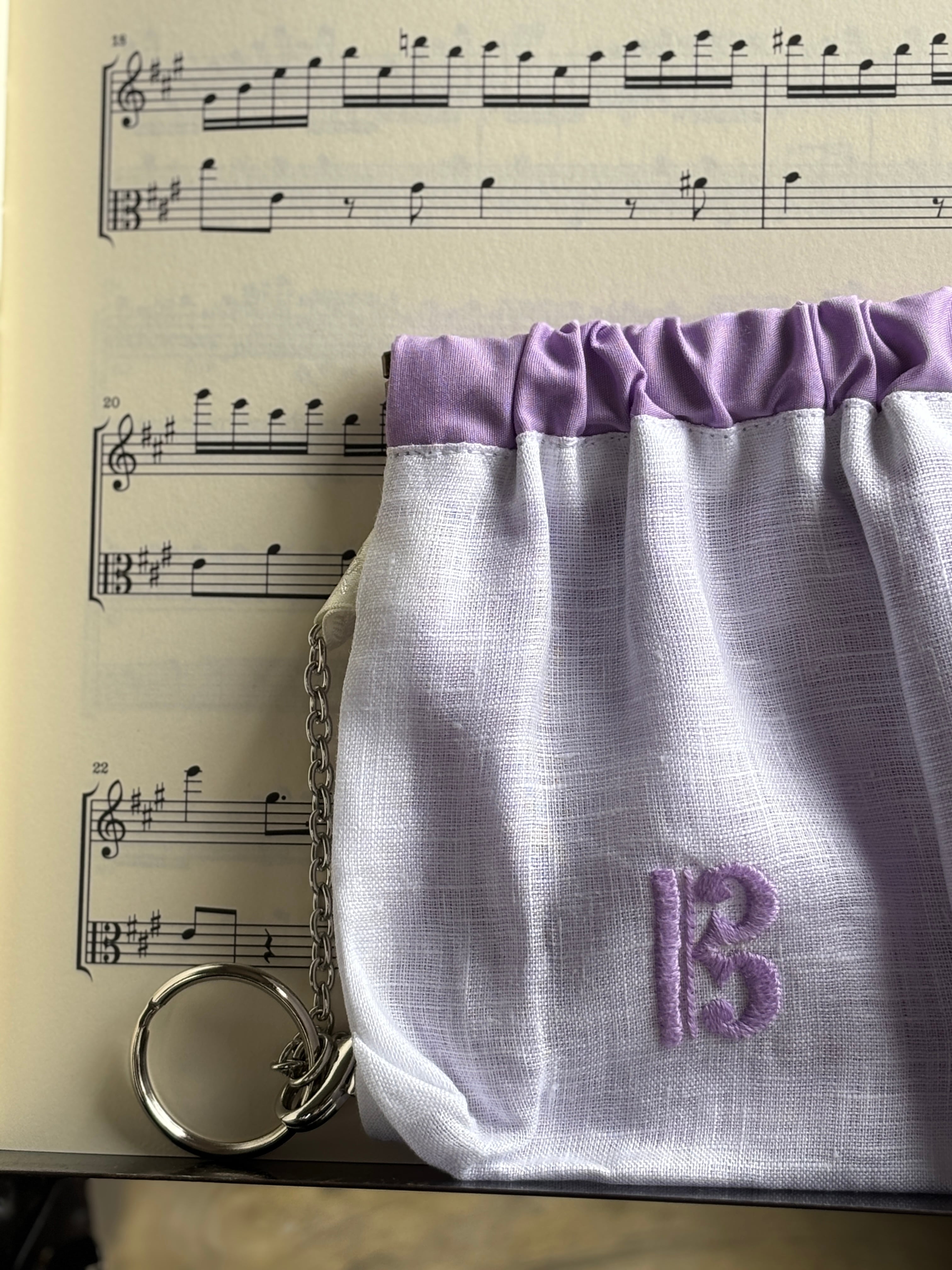 素材はリネン、手刺繍で音部記号をワンポイントで入れています。