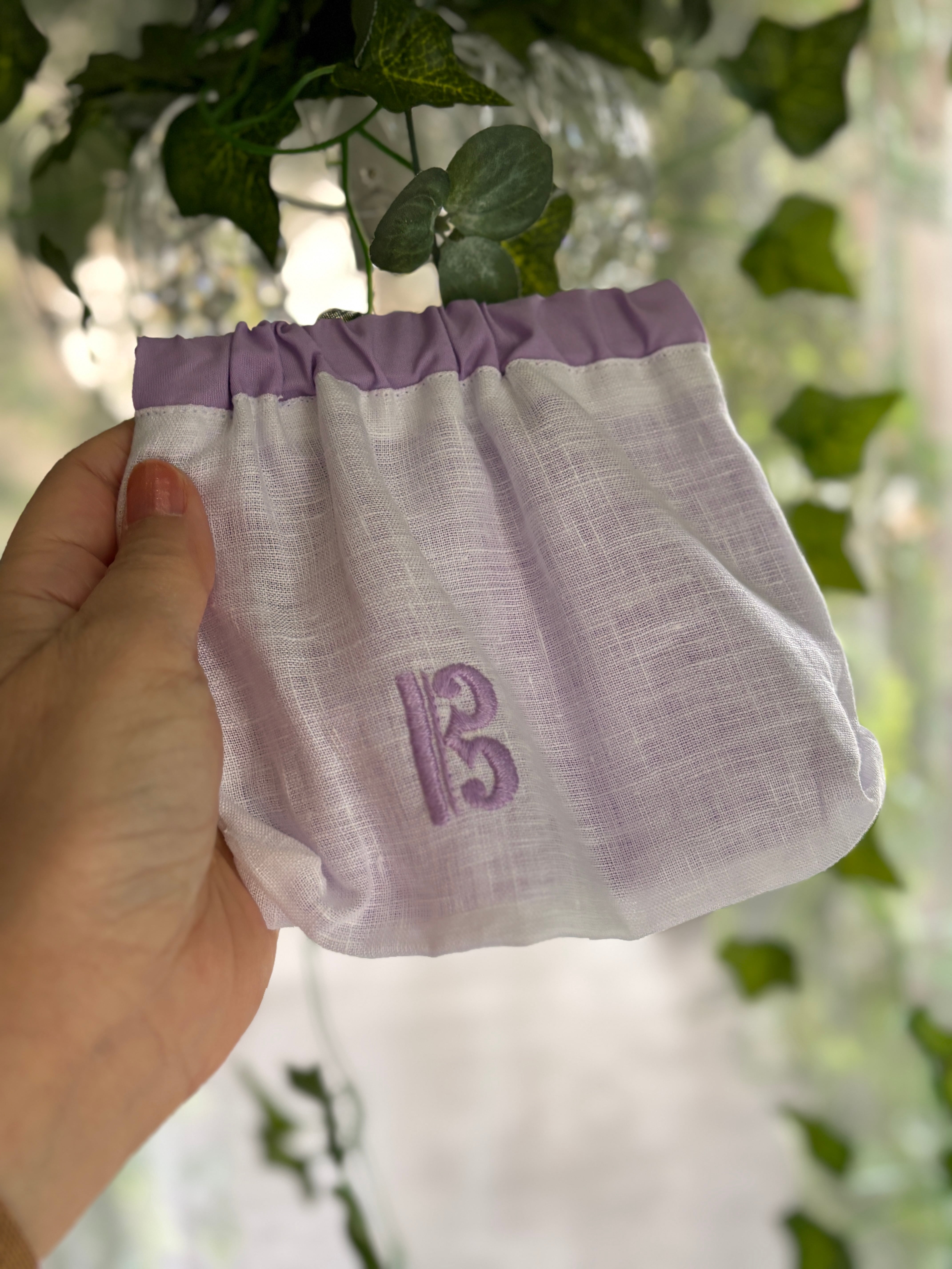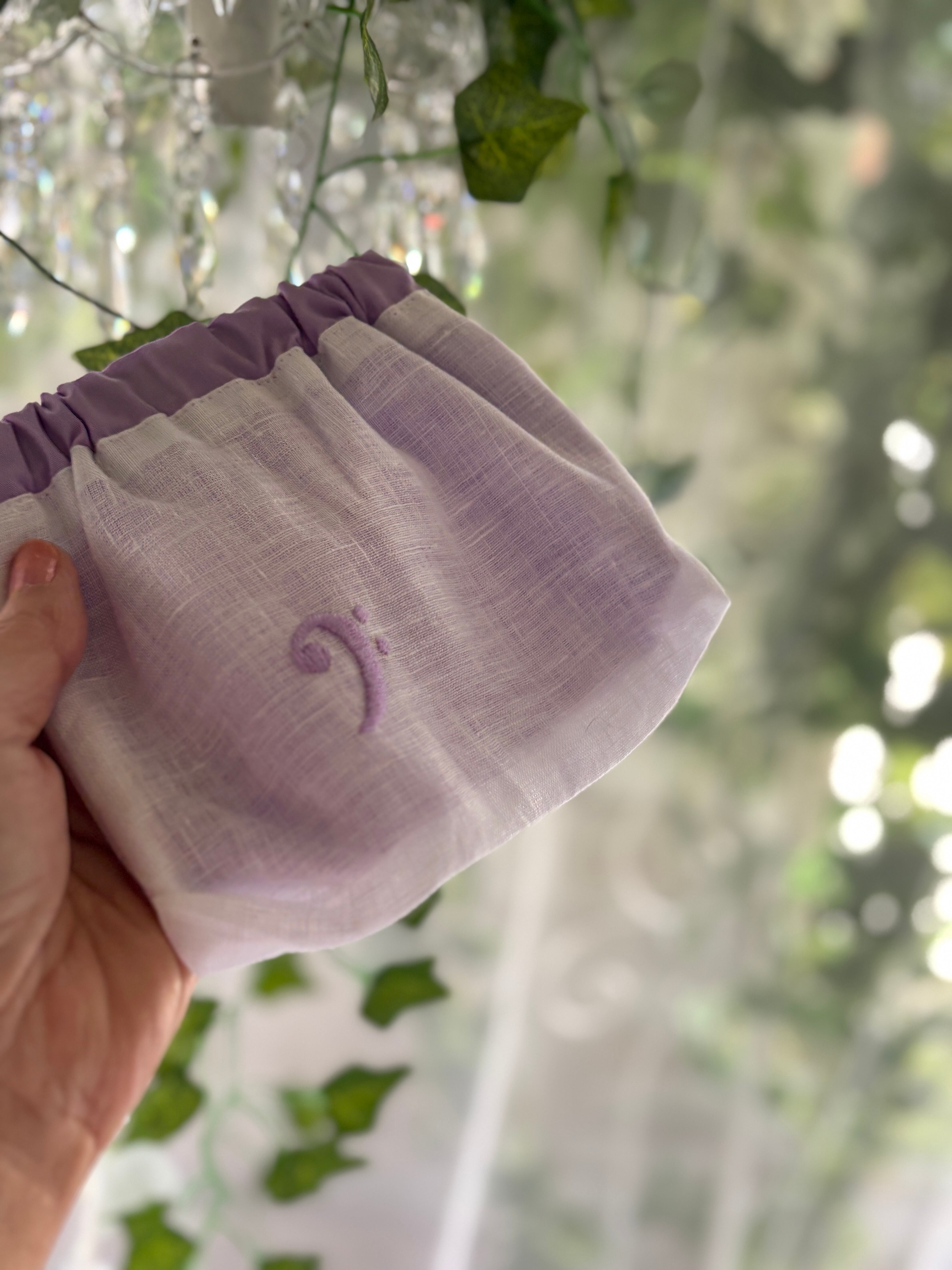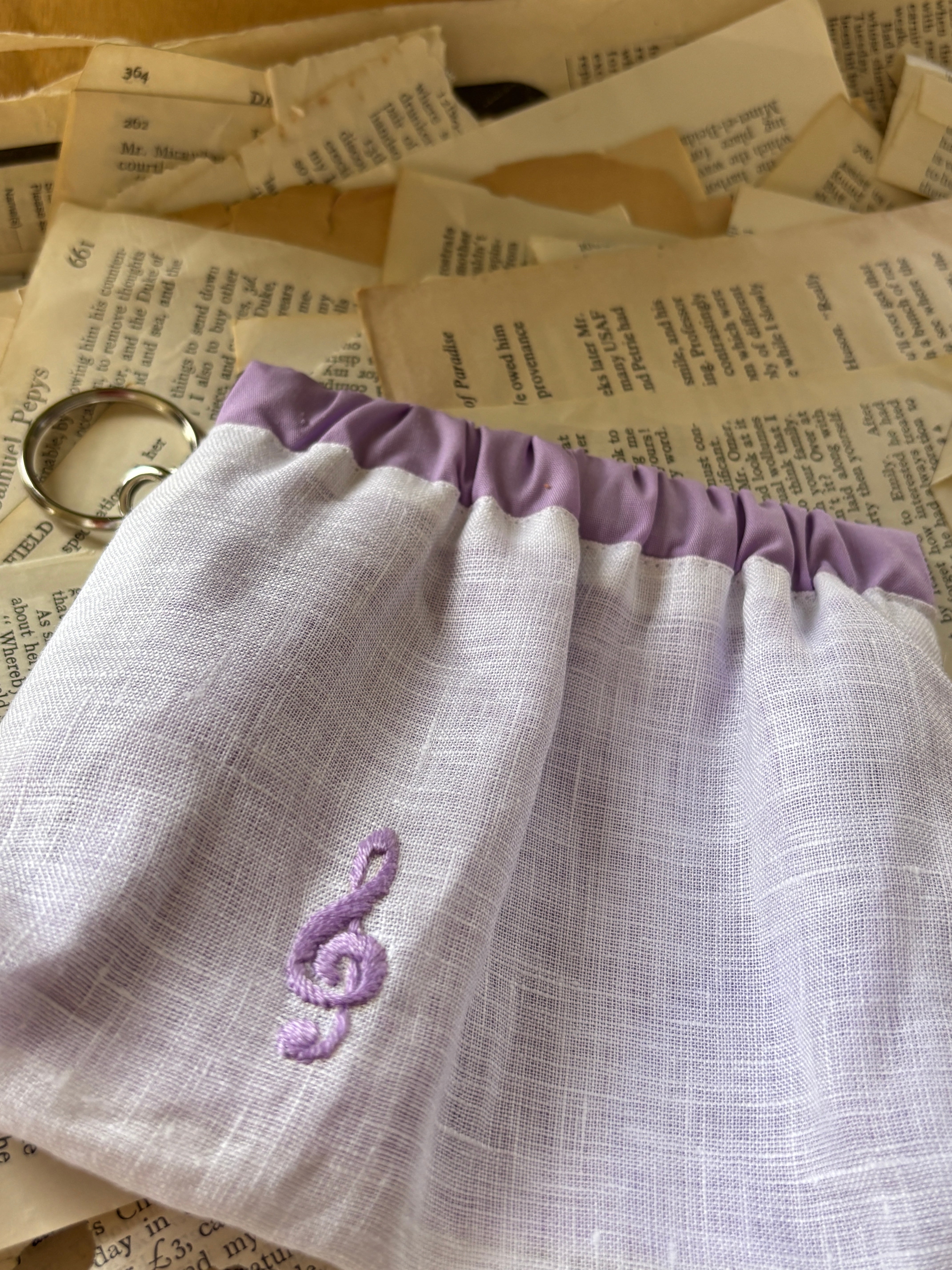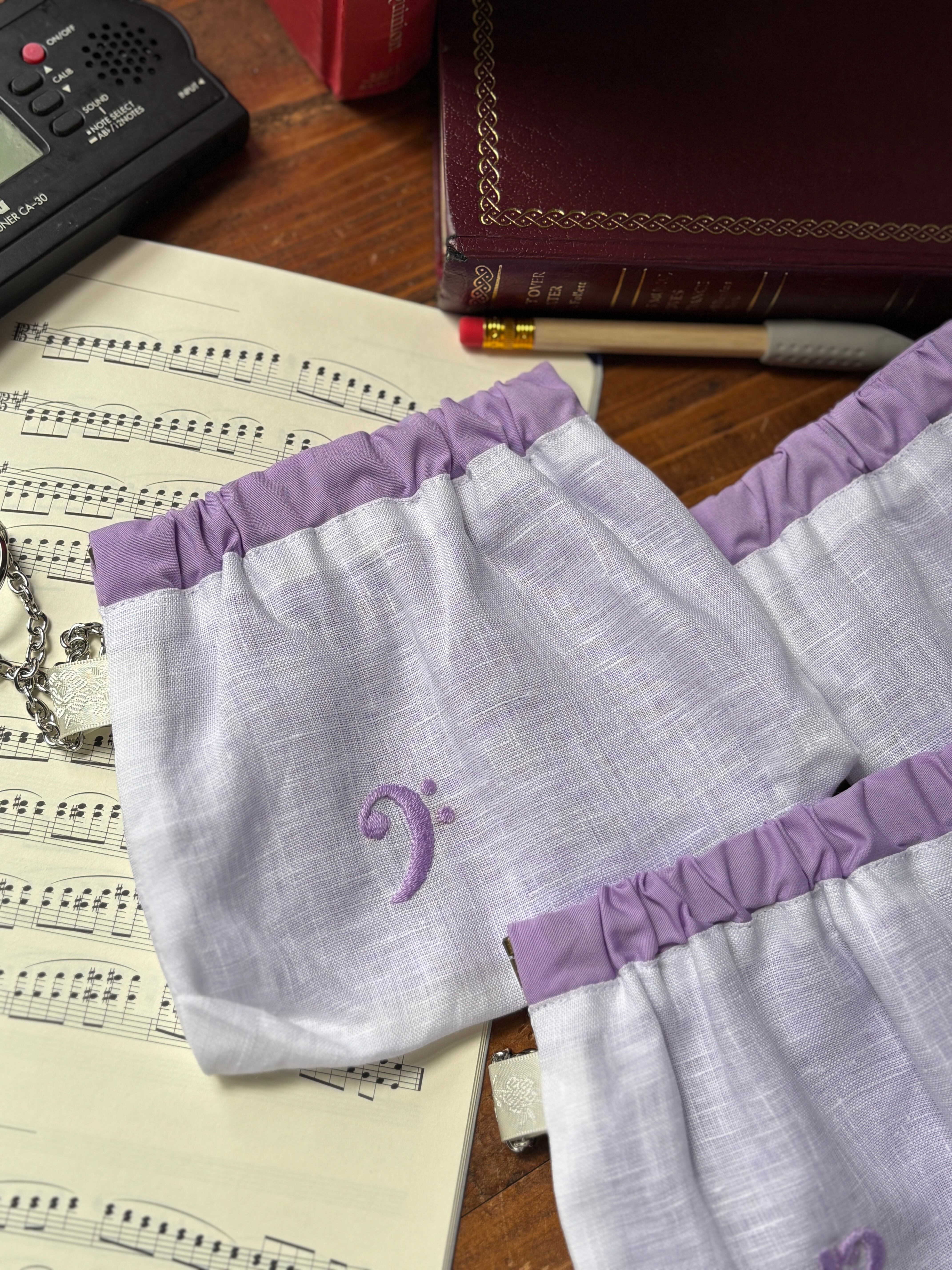 素材はリネン、手刺繍で音部記号をワンポイントで入れています。