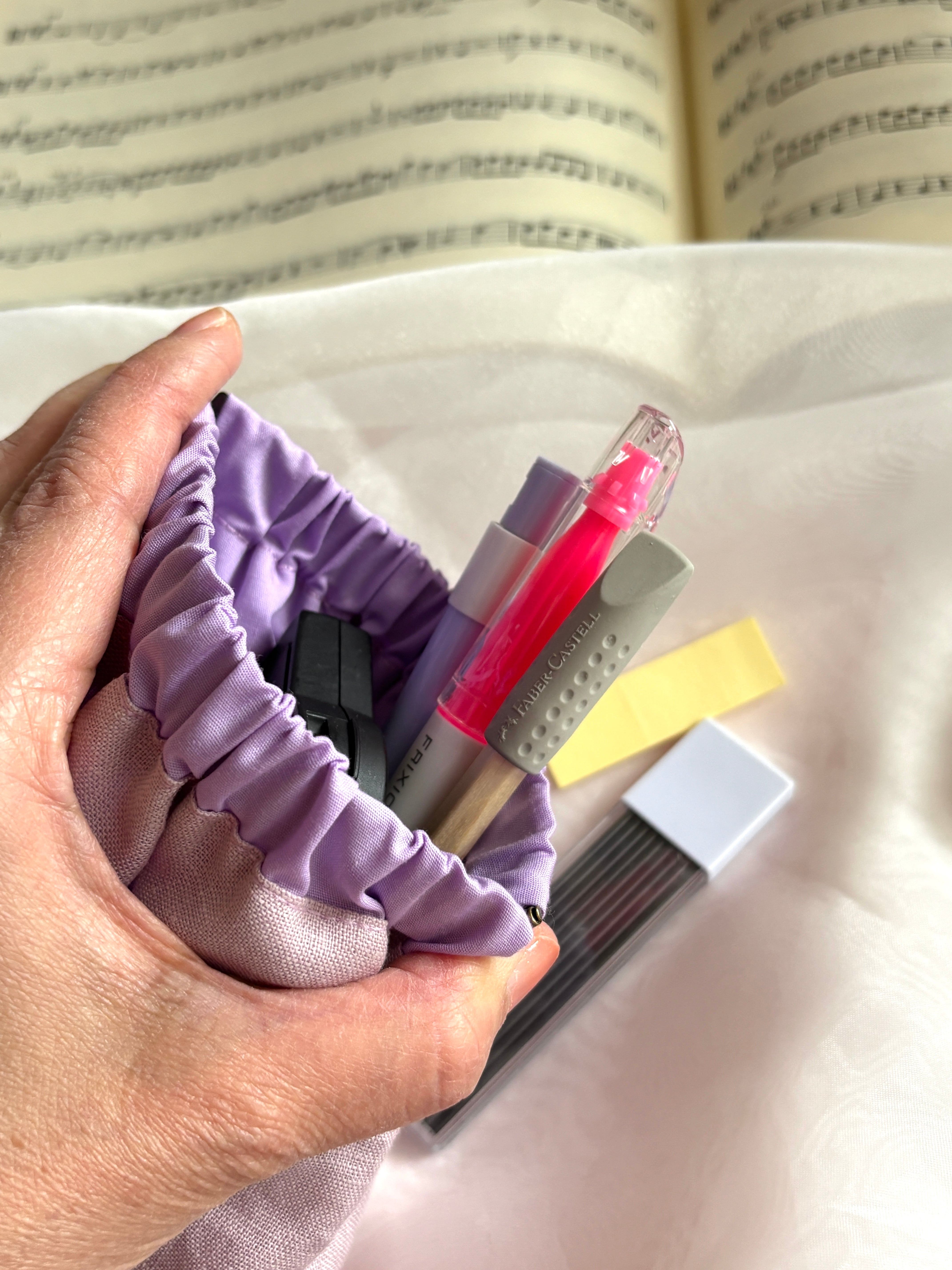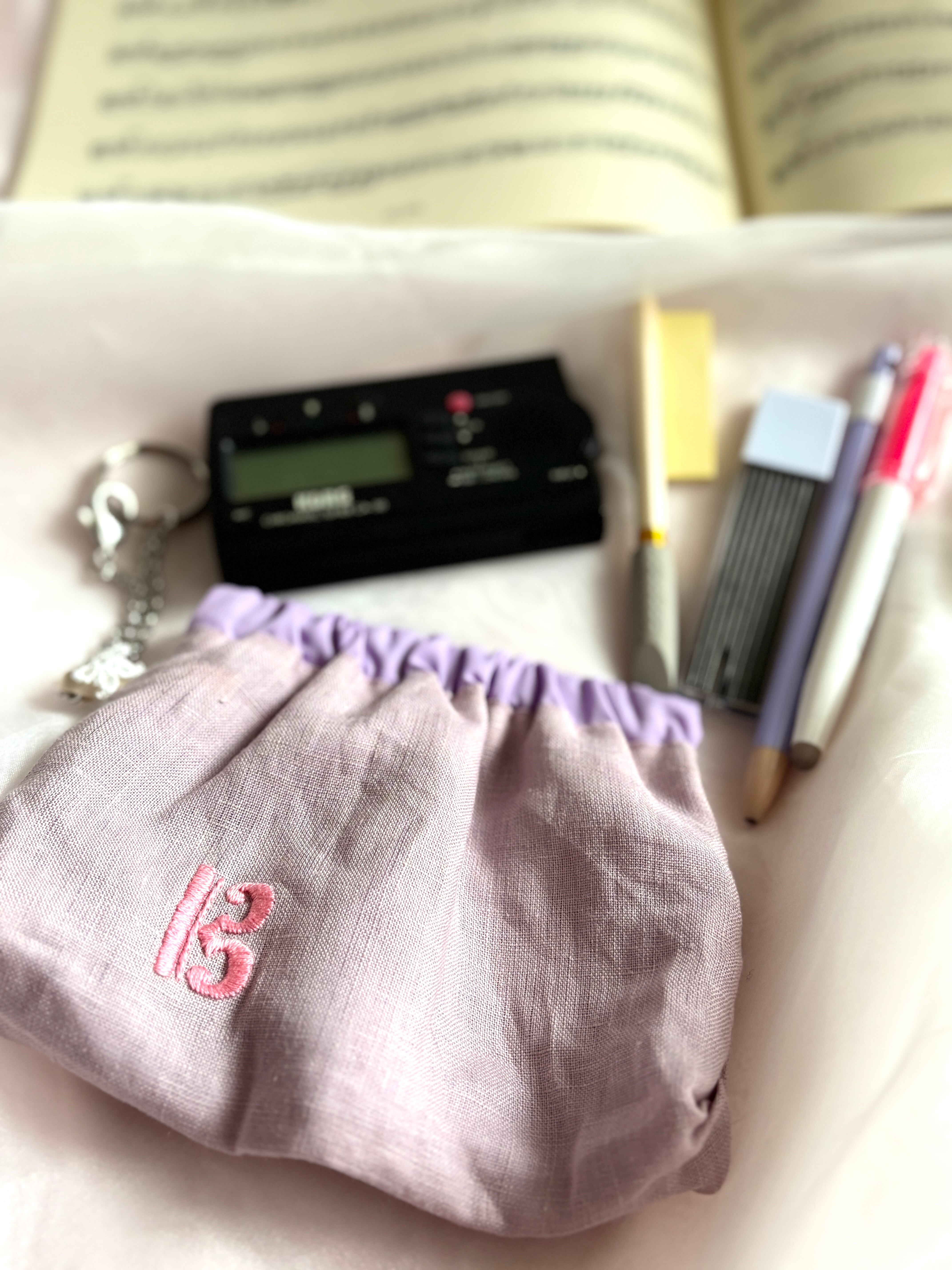 チューナーや筆記用具など合奏に必要な細々したものをまとめておけるバネ口ポーチです。